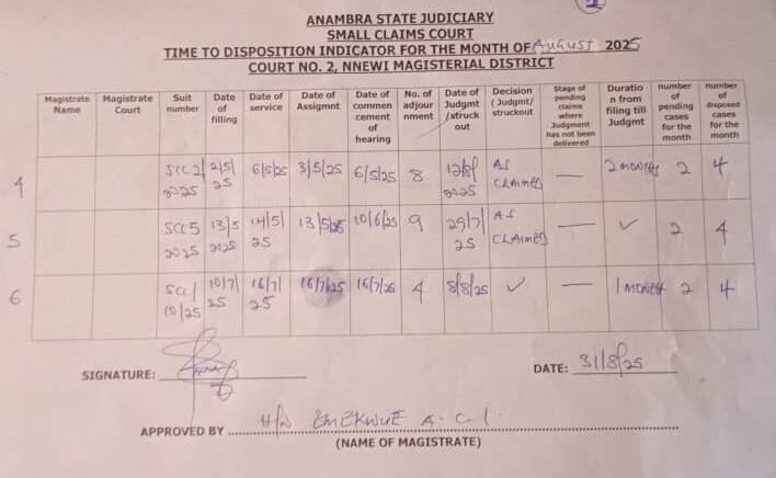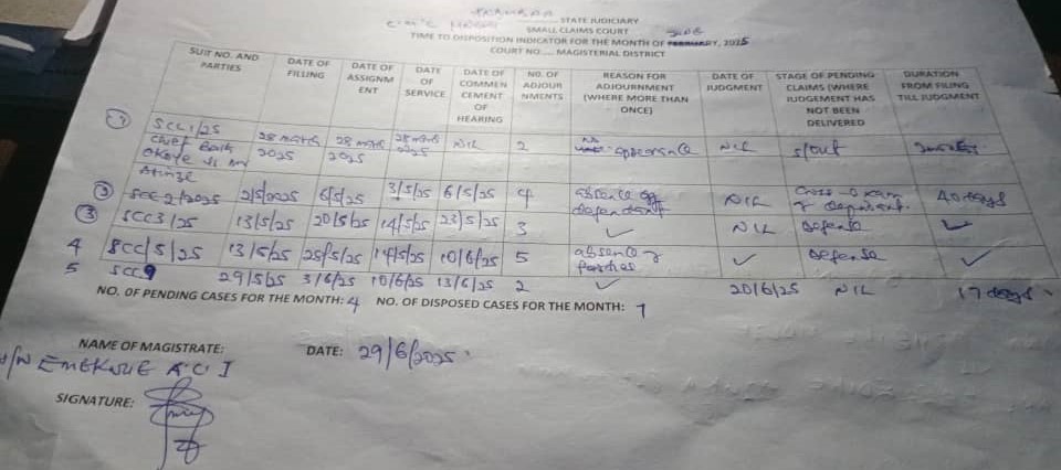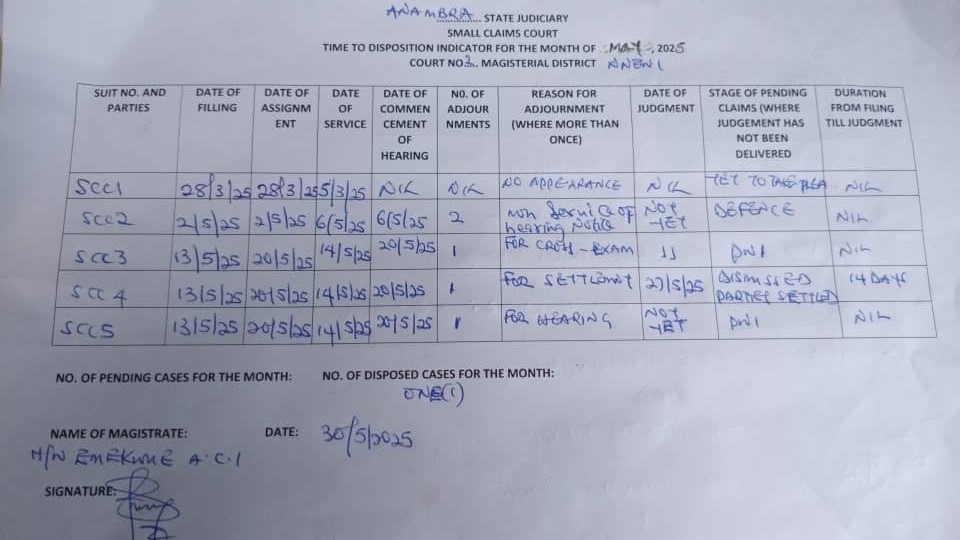 The Monthly Time to Disposition Indicator Report for Small Claims Courts, Anambra State Judiciary