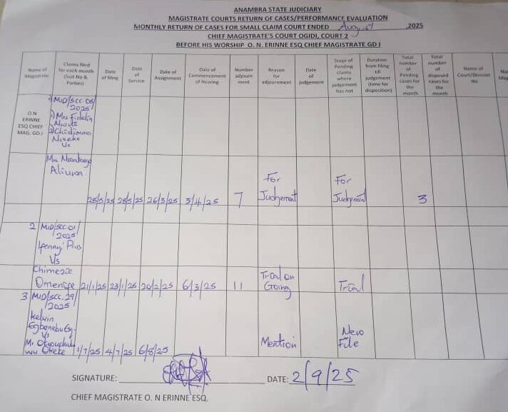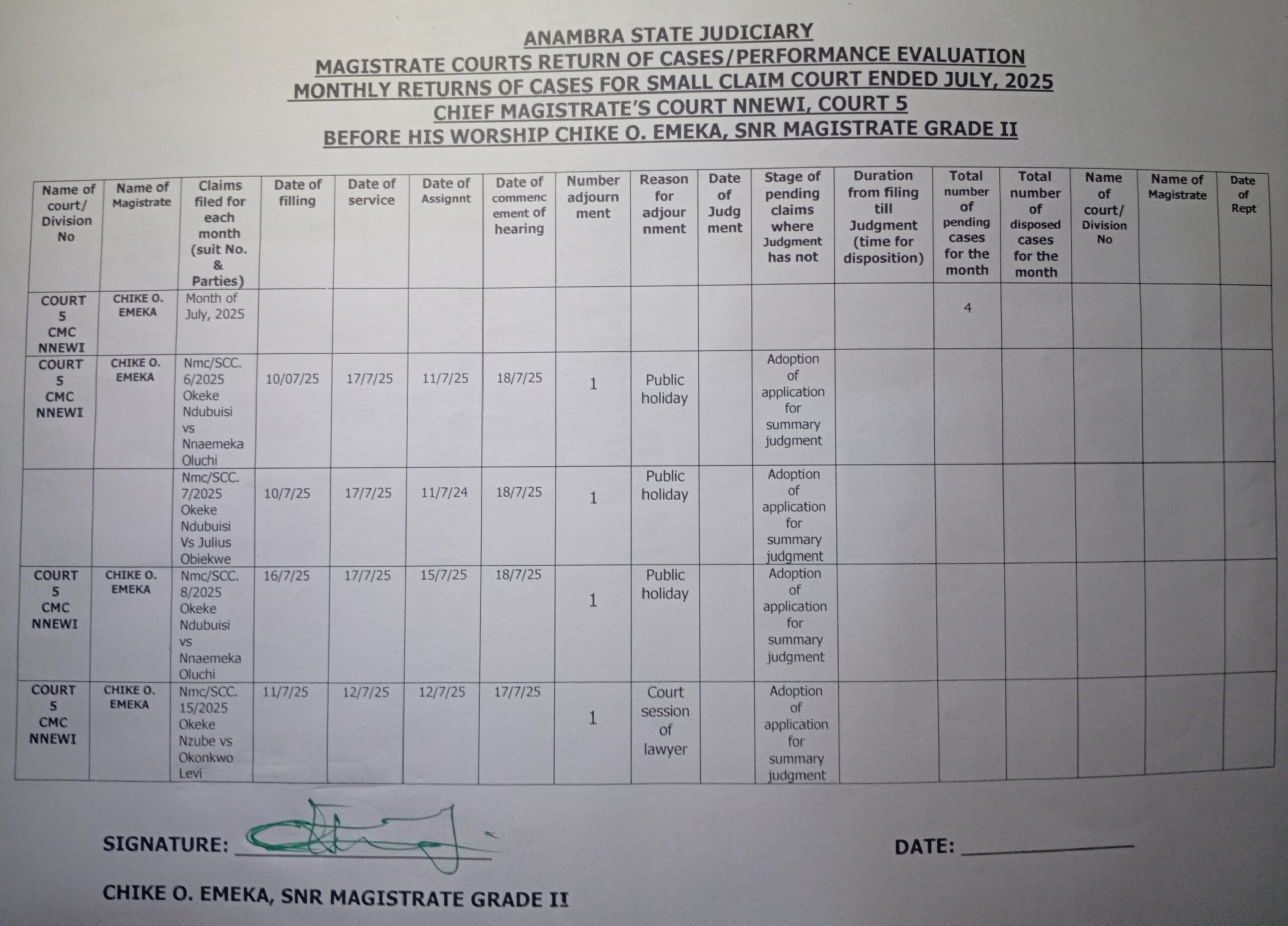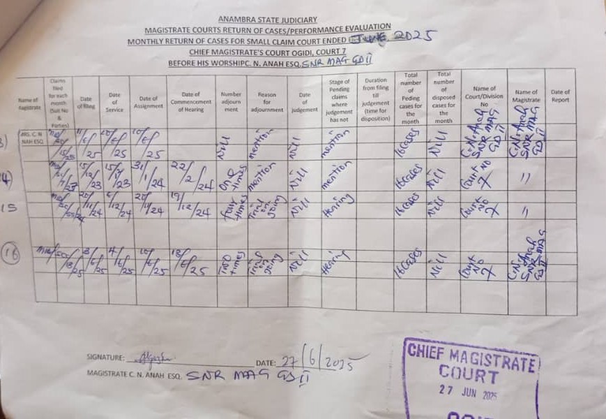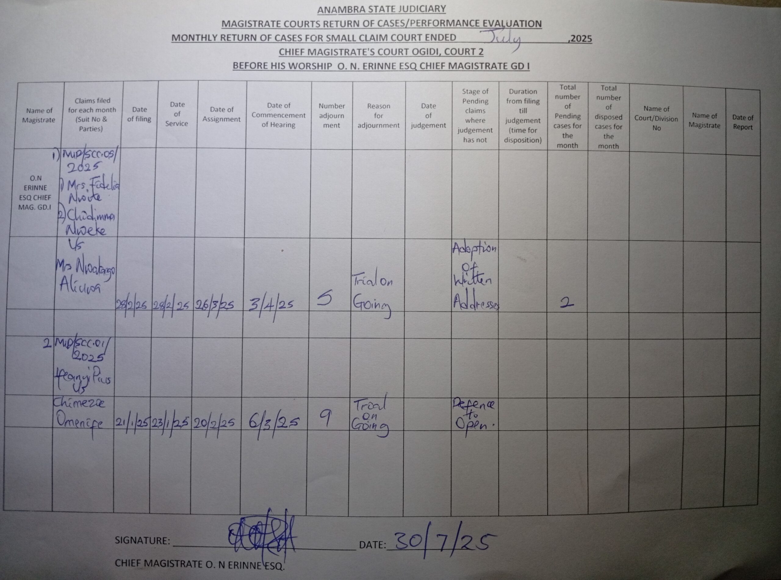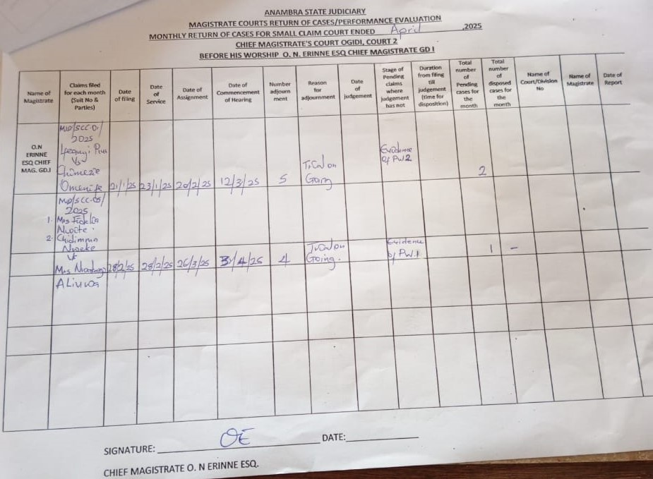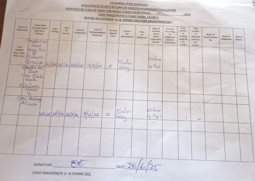 This page outlines the monthly and quarterly performance of Magistrate Courts handling Small Claims Cases within Anambra State. It includes detailed data on the progress of cases, from filing to disposition, and provides key performance indicators such as: